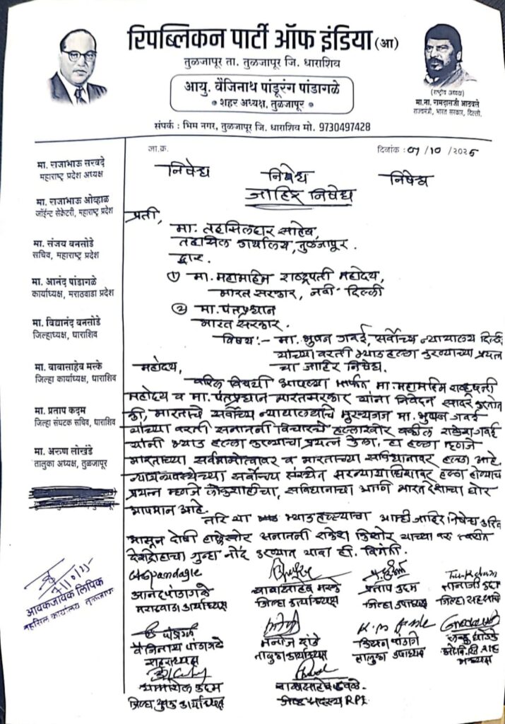 न्यायमूर्ती भूषण गवई यांच्यावर झालेल्या हल्ल्याच्या निषेधार्थ तुळजापूर तहसीलदारांना निवेदन देताना रिपब्लिकन पार्टी ऑफ इंडियाचे पदाधिकारी व कार्यकर्ते