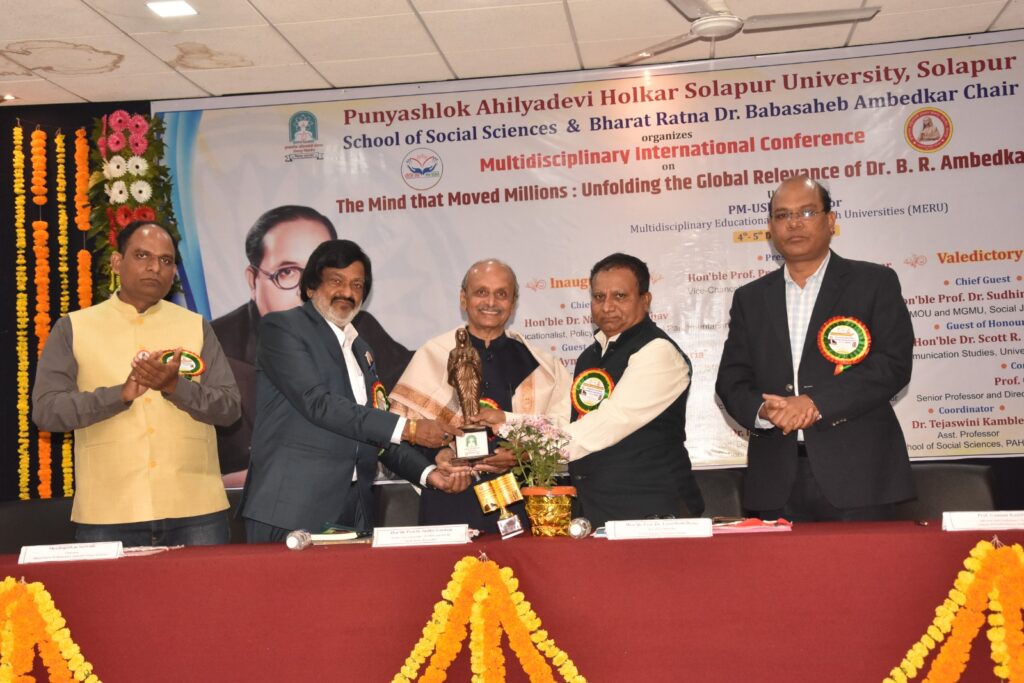 पुण्यश्लोक अहिल्यादेवी होळकर सोलापूर विद्यापीठाच्या सामाजिक शास्त्रे संकुल, प्रधानमंत्री उच्चतर शिक्षा अभियान आणि भारतरत्न डॉ. बाबासाहेब आंबेडकर अध्यासन केंद्र यांच्या संयुक्त विद्यमानाने ‘कोट्यावधी मनाला स्पर्श करणारे मन: भारतरत्न डॉ.बाबासाहेब आंबेडकर विचारांचे जागतिक संदर्भ’ या महत्त्वपूर्ण विषयावर ही आंतरराष्ट्रीय परिषदेच्या समारोप प्रसंगी डॉ. सुधिर गव्हाणे बोलत होते. यावेळी कार्यक्रमाच्या अध्यक्षस्थानी पुण्यश्लोक अहिल्यादेवी होळकर सोलापूर विद्यापीठाचे प्र. कुलगुरु डॉ. लक्ष्मीकांत दामा, भारतरत्न डॉ. बाबासाहेब आंबेडकर अध्यासन केंद्राचे अध्यक्ष राजाभाऊ सरवदे, सामाजिक शास्त्रे संकुलाचे संचालक डॉ. गौतम कांबळे, प्राचीन भारतीय इतिहास, संस्कृती आणि पुरातत्वशास्त्र विभागाचे प्रमुख डॉ. प्रभाकर कोळेकर उपस्थित होते.